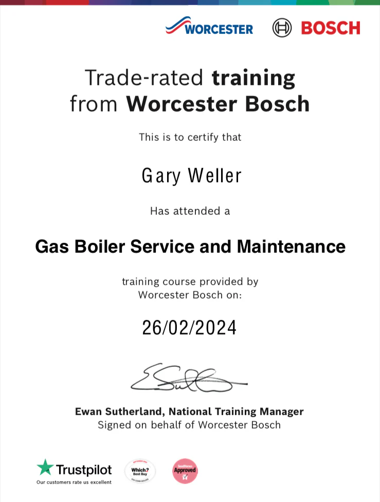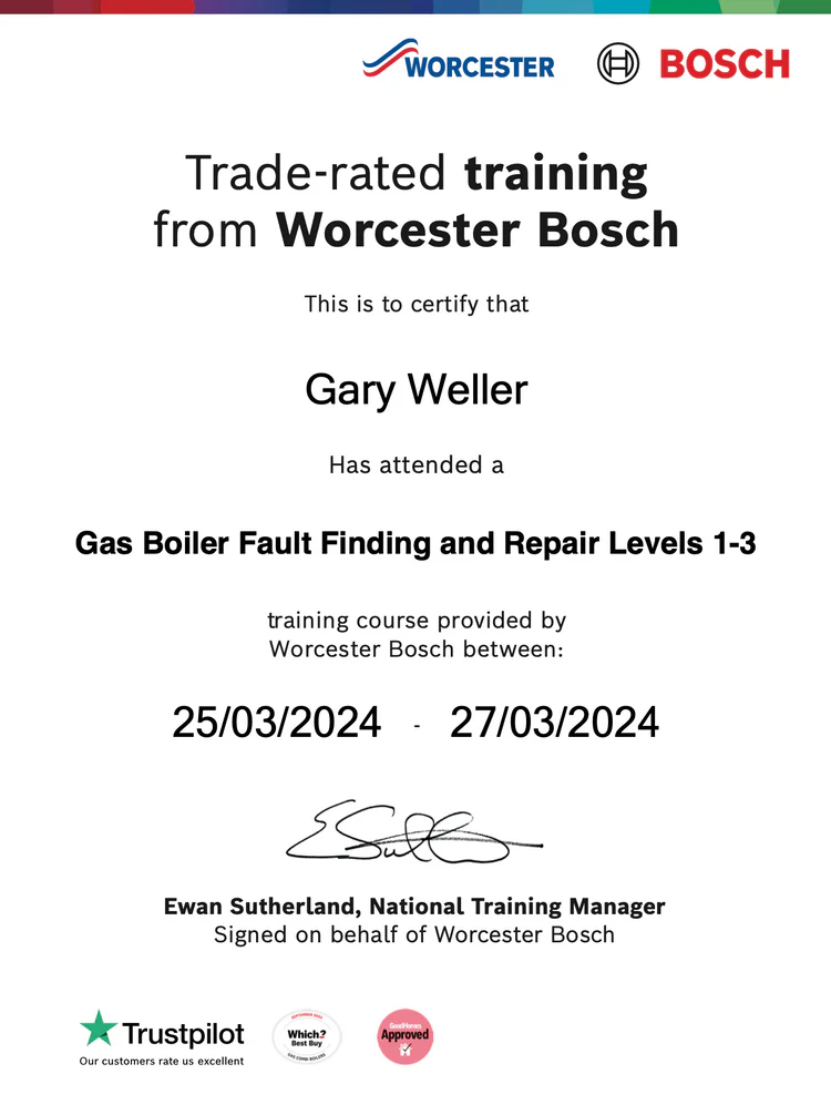 Certificates ecoTEC Plus Pro & ecoFIT Diagnostics & Fault FindingAwarded to Gary Weller (Apex Plumber) on 3 April 2023 aroTHERM Plus Installcommission set upAwarded to Gary Weller (Apex Plumber) on 4 April 2023 Worcester Bosch Gas Boiler Serviceand Maintenance trainingAwarded to Gary Weller (Apex Plumber) on 26th February 2024 Worcester Bosch Gas BoilerFault Finding and Repair Levels 1-3Awarded to Gary Weller (Apex Plumber) on 27th March 2024